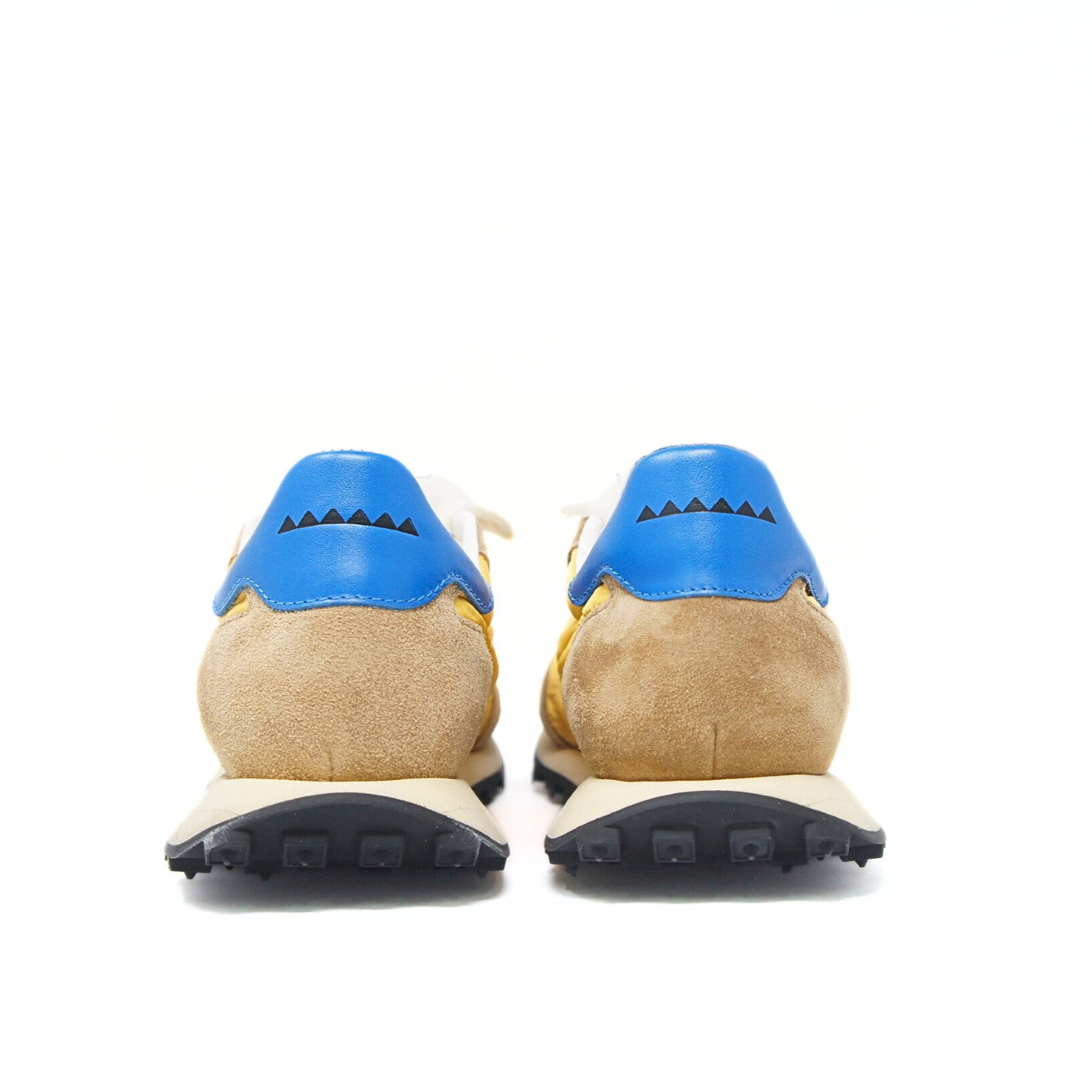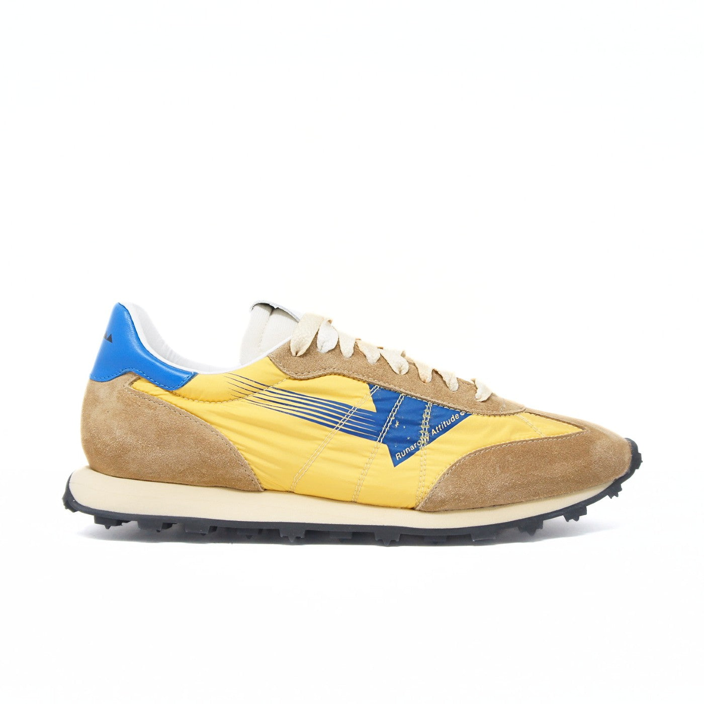 Made in Italy, the Atlante M sneaker combines leather and fabric in a sophisticated mix of camel and yellow with blue details. Calfskin interior and two-tone sole for excellent comfort.